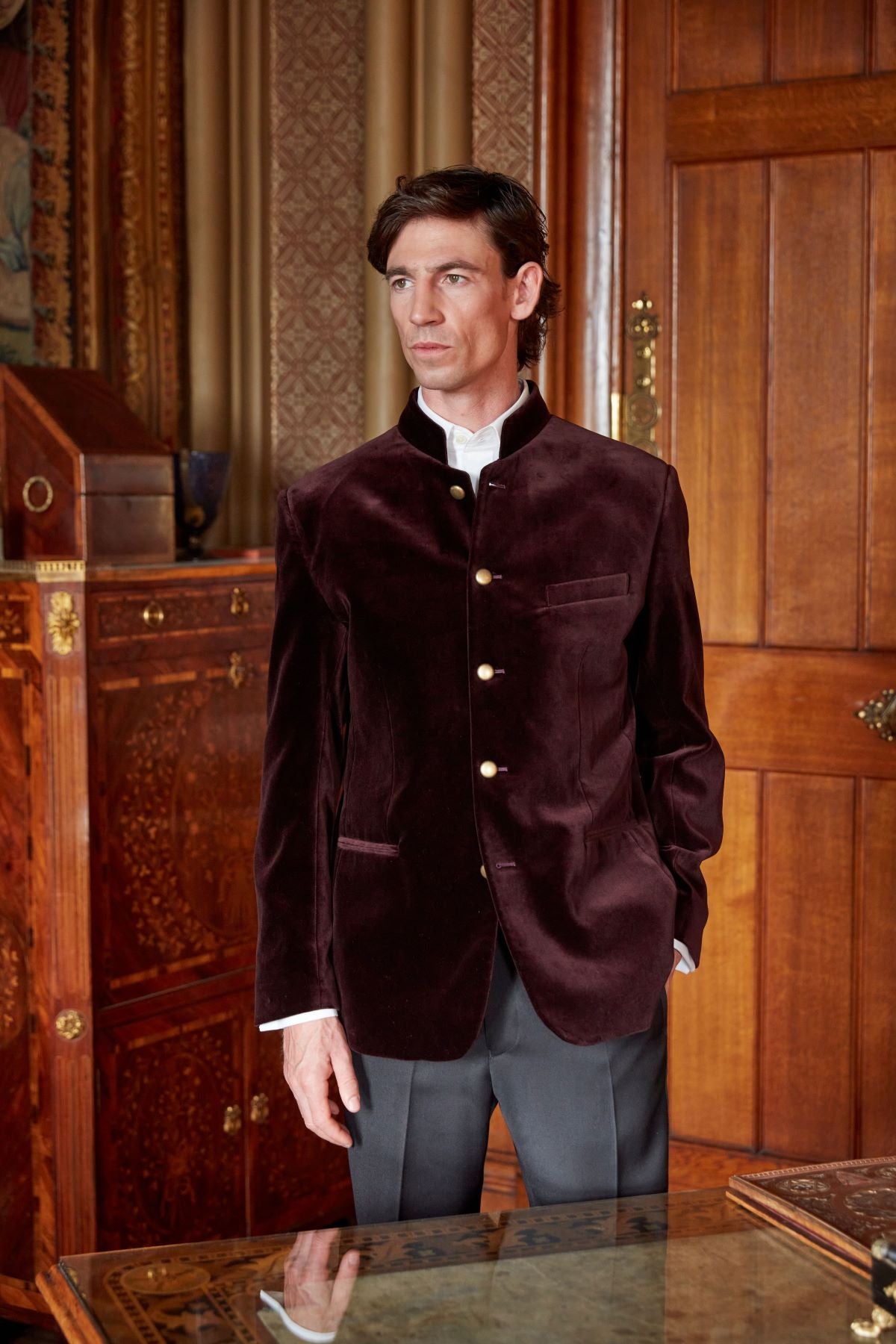 Nehru jackets are distinguished by their streamlined shape and absence of lapels, creating a contemporary profile rooted in traditional tailoring. At Favourbrook, our Nehru jackets are designed for modern eveningwear, offering a confident, individual alternative to more conventional formal jackets.